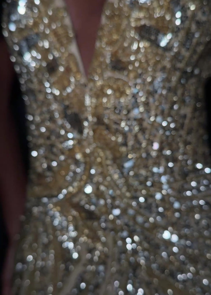 This strapless gown is sure to turn heads. The sweetheart neckline is complete with a modern floral sequin motif that continues down the bustier and skirt. The skirt is complete with a left leg slit.
