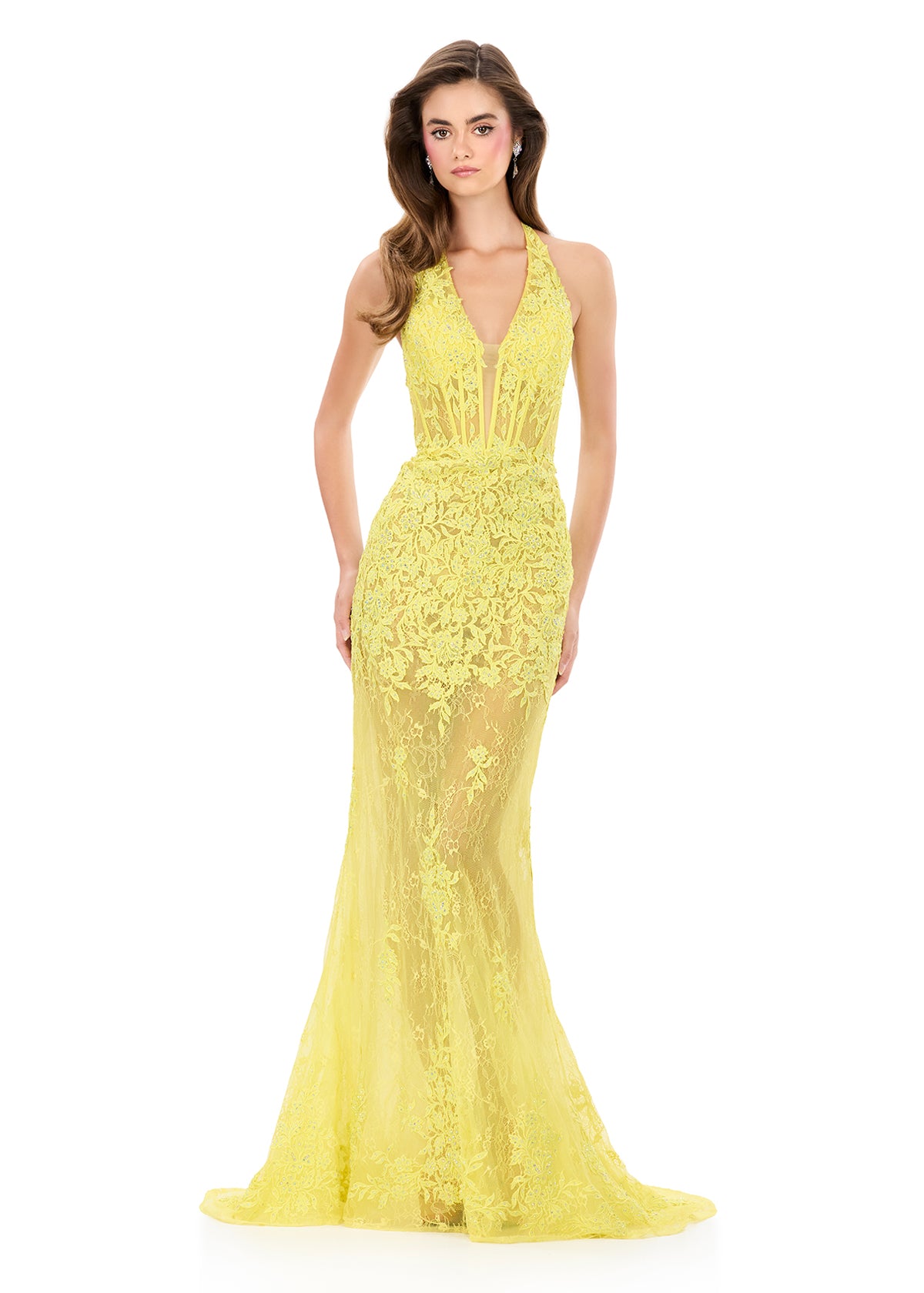 ASHLEYlauren 12177 | Yellow lace gown with plunging neckline, sheer corset bodice, intricate beadwork, and left leg slit