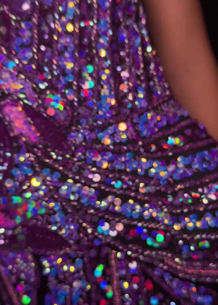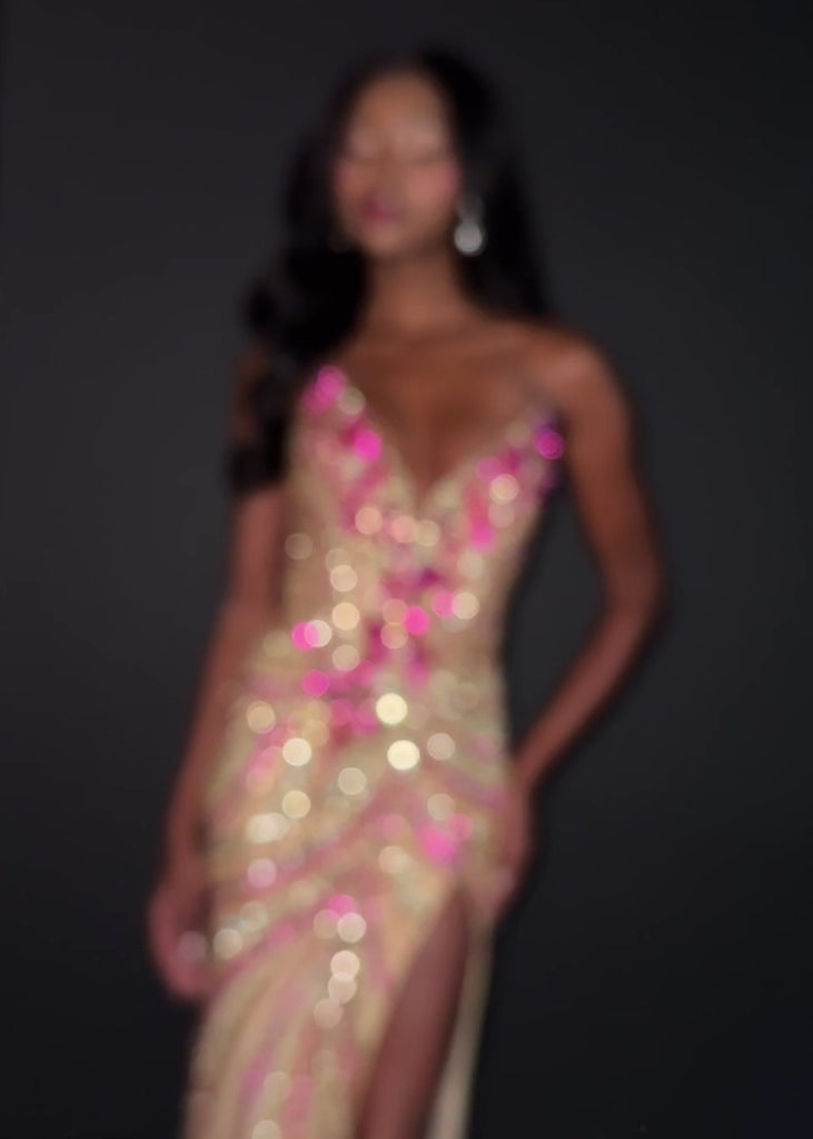 This strapless gown is sure to turn heads. The sweetheart neckline is complete with a modern floral sequin motif that continues down the bustier and skirt. The skirt is complete with a left leg slit.