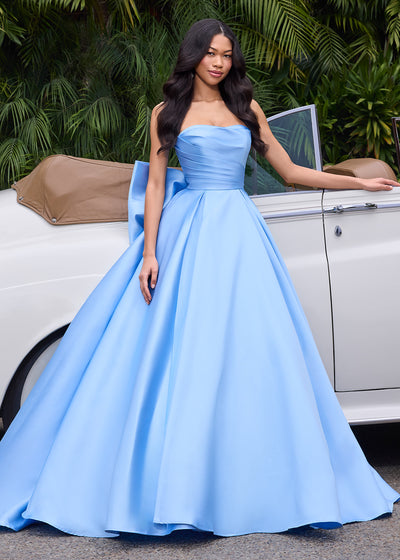 Make an entrance with this strapless taffeta gown! Featuring a cascading side ruffle and left leg slit, this gown was meant to turn heads!