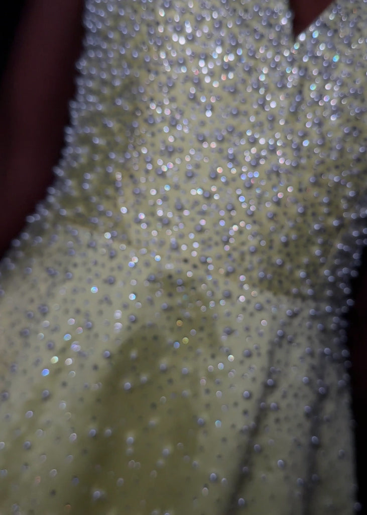 Pretty in Pearls in ASHLEYlauren Style 12160. This glamorous A-line gown features a plunging V-neckline and illusion sides. The shimmering heat set stones and pearls that catch the light beautifully. The fitted bodice flows effortlessly into a full Mikado skirt with a sweep train, creating a show-stopping silhouette perfect for pageant, prom, or any formal event.