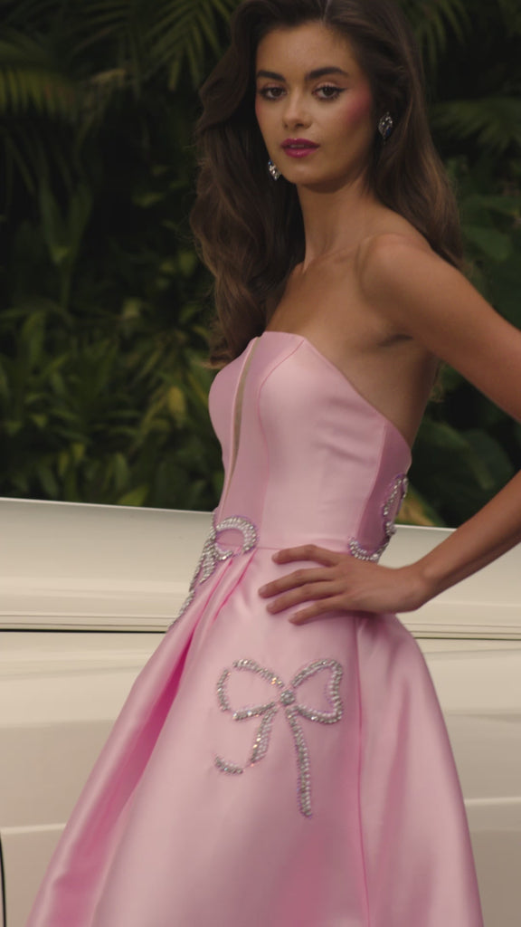 Be bold in this ASHLEYlauren Style 12207 A-Line bow gown. The structured Mikado fabric creates a timeless silhouette, while sparkling crystal and pearl bow embellishments add a touch of playful sophistication. The illusion plunge neckline and full skirt make this gown a show stopper.