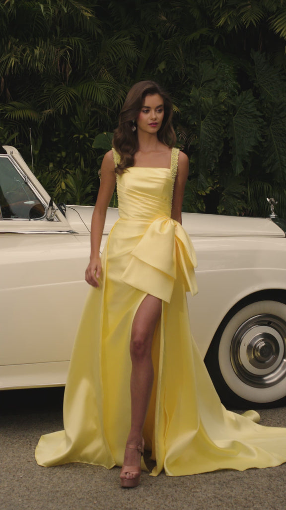 • A Mikado ballgown featuring a structured bodice, detachable overskirt with bow accent, fitted inner skirt with slit for a dramatic high-fashion look.